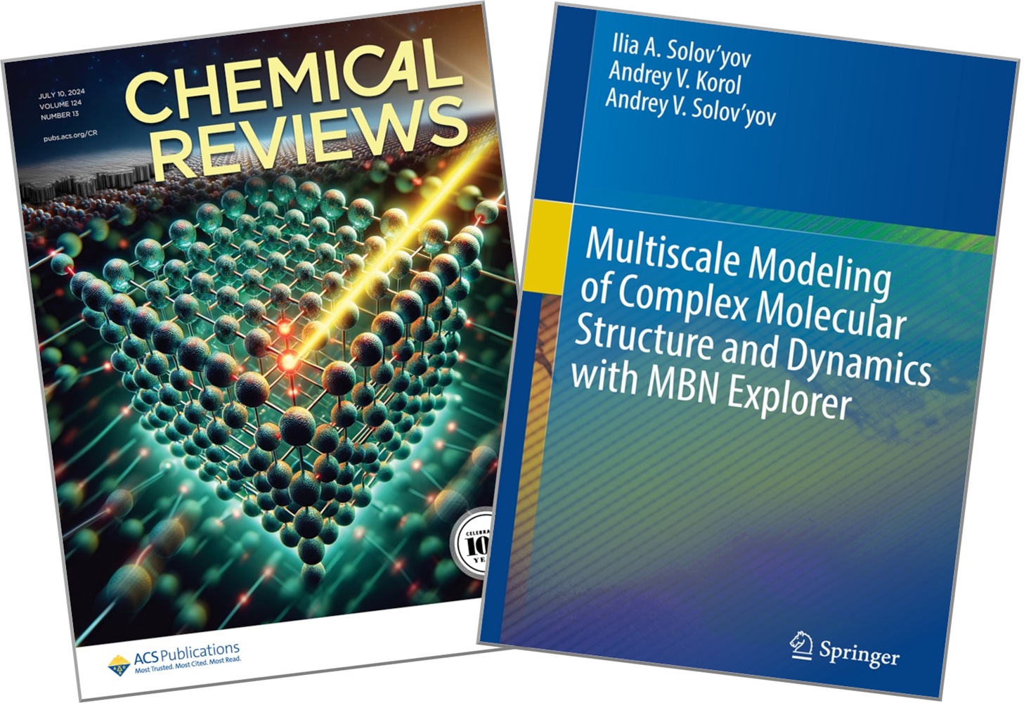 Left: Cover page of volume 124, issue 13 of Chemical Reviews, highlighting the publication of a roadmap paper on multiscale theory, simulations, and experimental studies of condensed matter systems exposed to radiation Right: "Multiscale Modeling of Complex Molecular Structure and Dynamics with MBN Explorer" (Springer monograph by I.A. Solov'yov, A.V. Korol and A.V. Solov'yov)