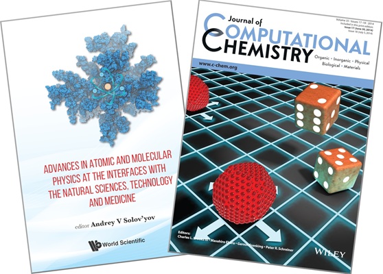 Left: "Advances in Atomic and Molecular Physics at the Interfaces with the Natural Sciences, Technology and Medicine" (World Scientific; ed. A.V. Solov'yov) Right: Cover page of volume 35, issue 17 of the Journal of Computational Chemistry, highlighting the publication of the key reference article on the implementation of 3D kinetic Monte Carlo module in MBN Explorer