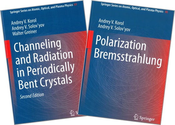 Left: "Channeling and Radiation in Periodically Bent Crystals" (Springer Series on Atomic, Optical, and Plasma Physics; monograph by A.V. Korol, A.V. Solov'yov and W. Greiner) Right: "Polarization Bremsstrahlung" (Springer Series on Atomic, Optical, and Plasma Physics; monograph by A.V. Korol and A.V. Solov'yov)