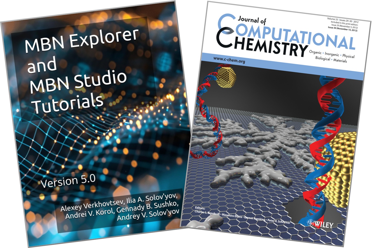 Left: "MBN Explorer and MBN Studio Tutorials: Version 5.0" (monograph by A. Verkhovtsev, I.A. Solov'yov, A.V. Korol, G.B. Sushko, and A.V. Solov'yov) Right: Cover page of volume 33, issue 30 of the Journal of Computational Chemistry, highlighting publication of the key reference article on MBN Explorer
