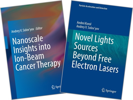 Left: "Nanoscale Insights into Ion-Beam Cancer Therapy" (Springer; ed. A.V. Solov'yov) Right: "Novel Light Sources Beyond Free Electron Lasers" (Springer series on Particle acceleration and detection; monograph by A.V. Korol and A.V. Solov'yov)